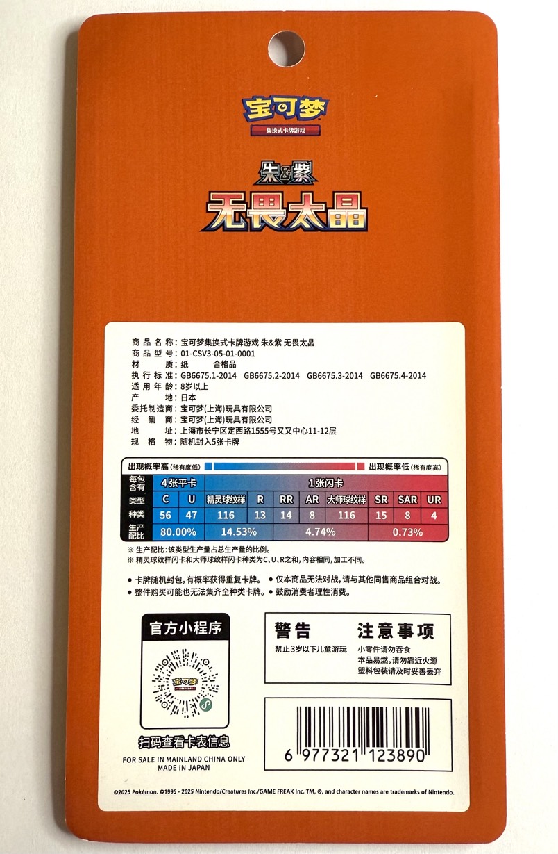 Inhalt der Displaybox: 24 x Booster Packs "Fearless Terestal" (CSV3C) 5 Pokémon Karten pro Booster Pack, die Booster Packs enthalten keineEnergiekarten / Codekarten Jedes einzelne Boosterpack ist seperat in einer Umverpackung innerhalb des Displays (siehe Bilder). Entdecke jetzt das neue Fearless Terestal Set in vereinfachtem Chinesisch. Die neueste Erweiterung der Pokémon Karmesin und Purpur TCG-Reihe exklusiv in vereinfachtem Chinesisch auf dem chinesischen Festland veröffentlicht. Umfangreiches Kartenangebot mit ca. 130 reguläre Karten + 35 Secret Rares – ein beeindruckender Mix beliebter Pokémon & seltener Glanzkarten.